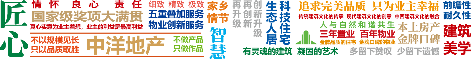 30載深耕江蘇,不以規(guī)模見長(zhǎng)、只以品質(zhì)取勝,一直用前瞻性和耐久性的戰(zhàn)略發(fā)展眼光,堅(jiān)持走高品質(zhì)樓盤路線,以業(yè)主居住的幸福指數(shù)衡量住宅的標(biāo)準(zhǔn)為追求,充分利用國(guó)內(nèi)外先進(jìn)的、成熟的綠色環(huán)保技術(shù)和材料,高度生態(tài)化、智能化,最大限度地提升居住的舒適度,建成國(guó)家標(biāo)準(zhǔn)的綠色節(jié)能、低碳生活示范住宅、生態(tài)之城、科技之城和3A級(jí)百年住宅,開發(fā)的地產(chǎn)項(xiàng)目有:以中洋水景園為代表的1.0版作品、中洋現(xiàn)代城為代表的2.0版作品、中洋·高爾夫公寓為代表的3.0版作品、中洋金磚公寓為代表的4.0版作品等,以及中洋金磚酒店為代表的商業(yè)地產(chǎn)項(xiàng)目,目前正在開發(fā)5.0版本作品——中洋金鑲玉公寓,以及海洋廣場(chǎng)商業(yè)綜合體。